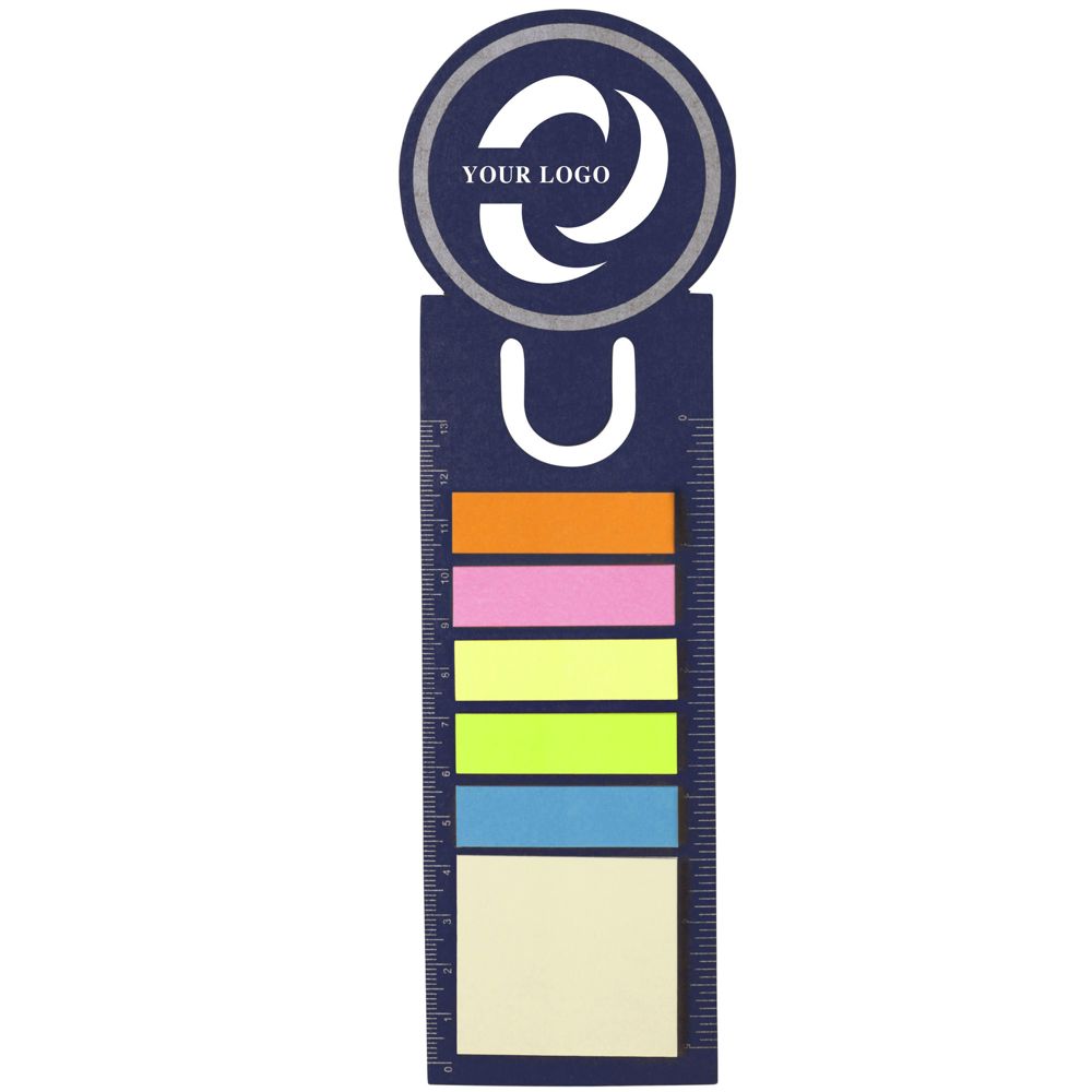 Kartonnen boekenlegger met zes verschillende zelfklevende memoblaadjes (16 stuks), en een voorgedrukte liniaal (cm en inch).