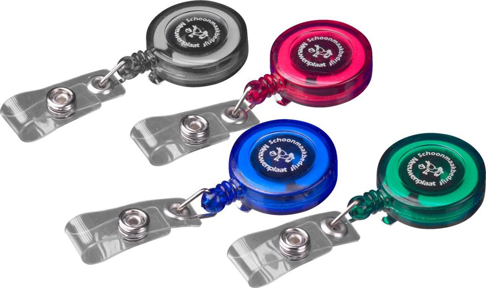 Transparant kunststof naamkaarthouder met trekkoord (ca. 80 cm), en metalen clip.