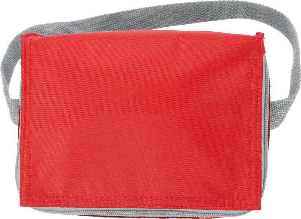 Polyester (420D) koeltas voor 6 blikjes, met ritssluiting en grijze draagband. De binnenzijde is voorzien van aluminiumfolie.