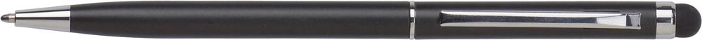 Elegante multifunctionele aluminium balpen, blauwschrijvend, met metalen clip. Door de rubberen top ook te gebruiken als capacitieve pen voor uw 'touch screen' schermen.