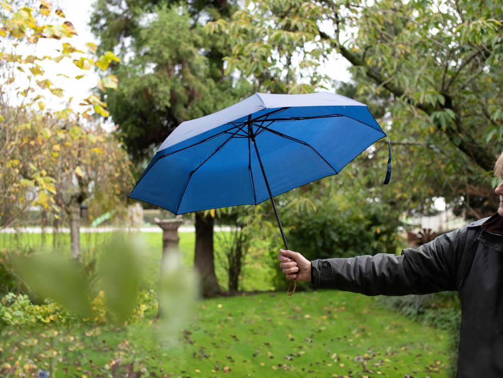 Opvouwbare handmatige polyester paraplu (190T), met 8 panelen, houten handvat met polskoord, metalen steel en baleinen en klittenbandsluiting, in een hoes.