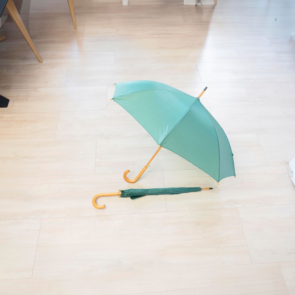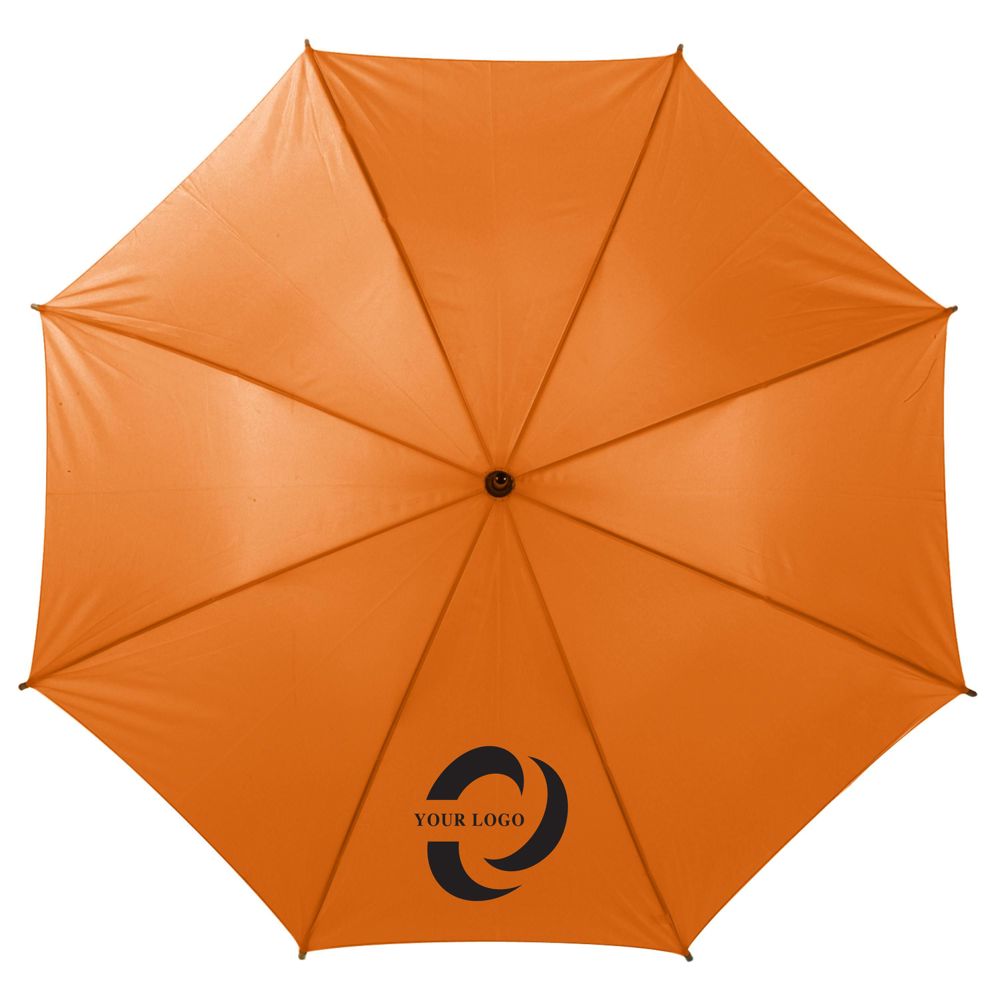 Klassieke automatische polyester paraplu (190T), met 8 panelen, gebogen houten handvat, tips en steel, metalen baleinen en klittenbandsluiting.