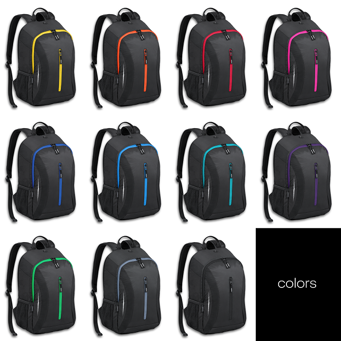Polyester rugzak (600D), met 2 ritsvakken en verstelbare gewatteerde schouderbanden.