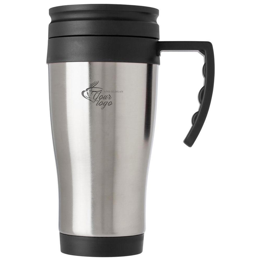 Dubbelwandige roestvrijstalen thermosbeker (420 ml), met kunststof binnenzijde, handgreep en deksel met schuifopening.