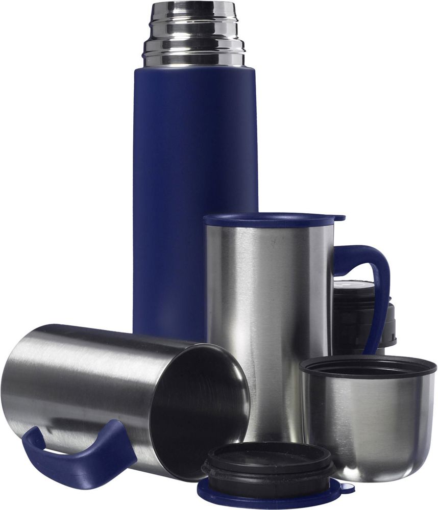 Thermosset bestaande uit een dubbelwandige roestvrijstalen vacuüm thermosfles (500 ml), en 2 roestvrijstalen thermosbekers (300 ml), met een kunststof handgreep en deksel.