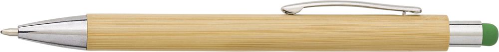 Bamboe balpen met kunststof punt en top, inclusief rubberen punt voor capacitieve schermen. De clip is van metaal. Blauwe inkt.