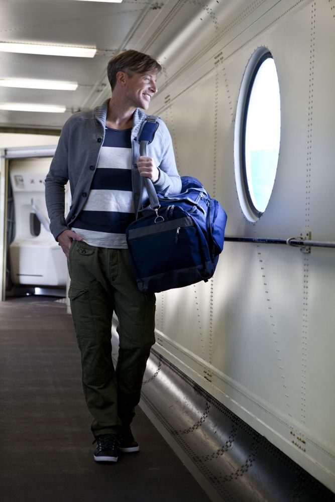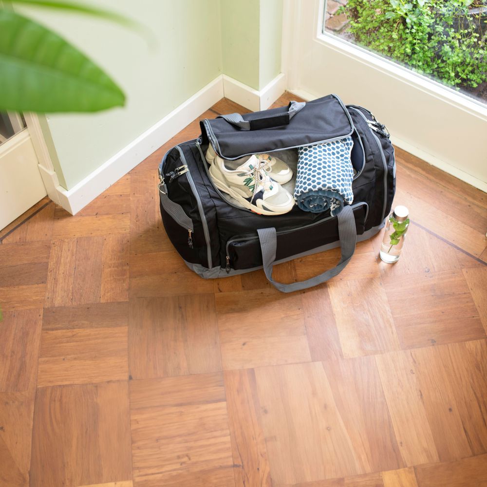 Polyester sporttas/reistas (600D), met 5 ritsvakken en verstelbare draagband.