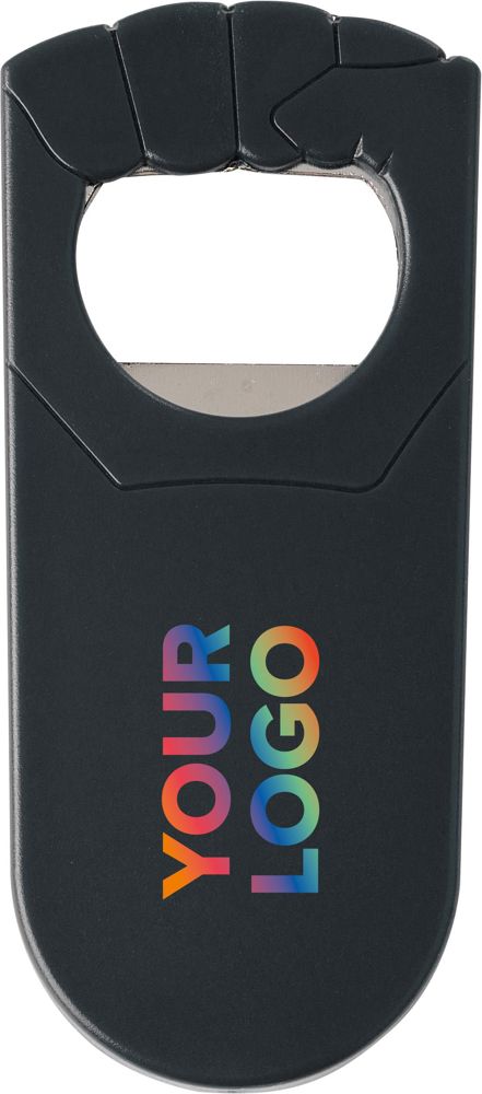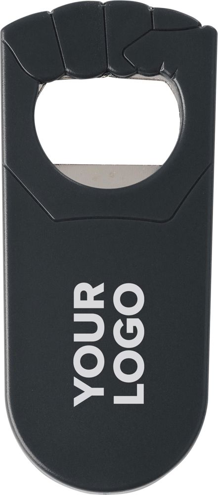 Kunststof en metalen flessenopener in de vorm van een vuist.