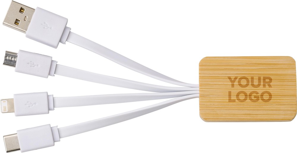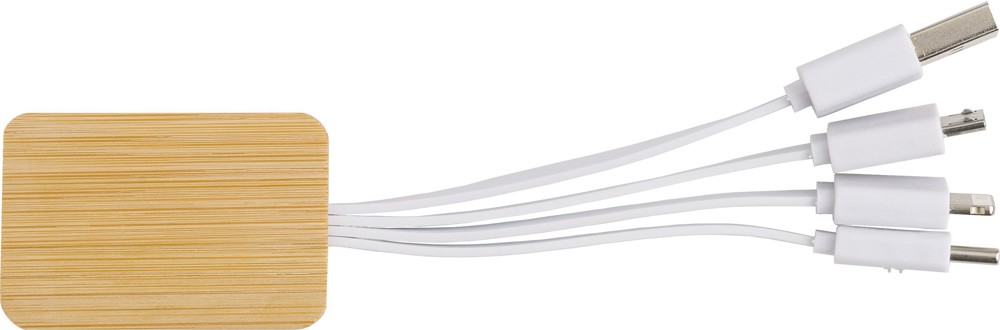 Bamboe drie-in-één oplaadkabel met standaard USB, micro USB, USB-C en lightning aansluiting. Deze oplader is alleen geschikt voor laptop/mobiel/tablet en werkt niet met een opladeradapter.