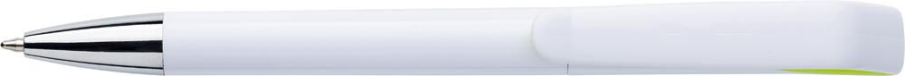 Kunststof balpen met gekleurde elementen, blauwschrijvend, met de clip in de vorm van een geometrische zwanenhals, met draaimechanisme.