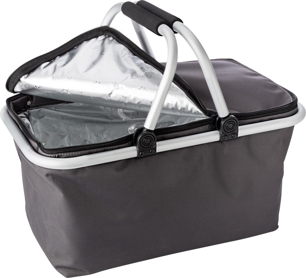 Polyester (320-330) opvouwbare boodschappenmand (Oxford) met koelvak, een aluminium frame en handvaten van EVA schuim, kan gesloten worden met een rits aan de bovenzijde.