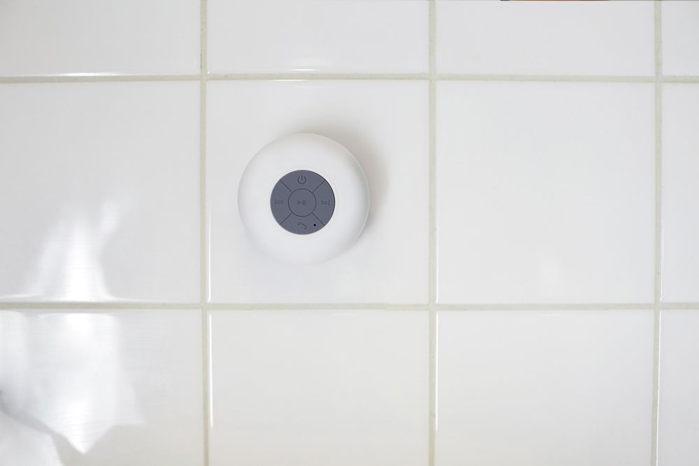 Kunststof speaker (2 watt) met draadloze verbindingstechnologie, spatwaterbestendig. Bel handsfree of luister naar muziek met deze speaker. Met zuignap voor gladde oppervlaktes. Op te laden via USB kabel.