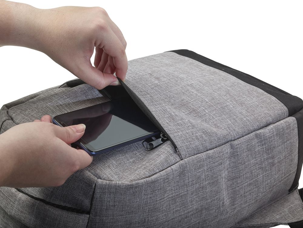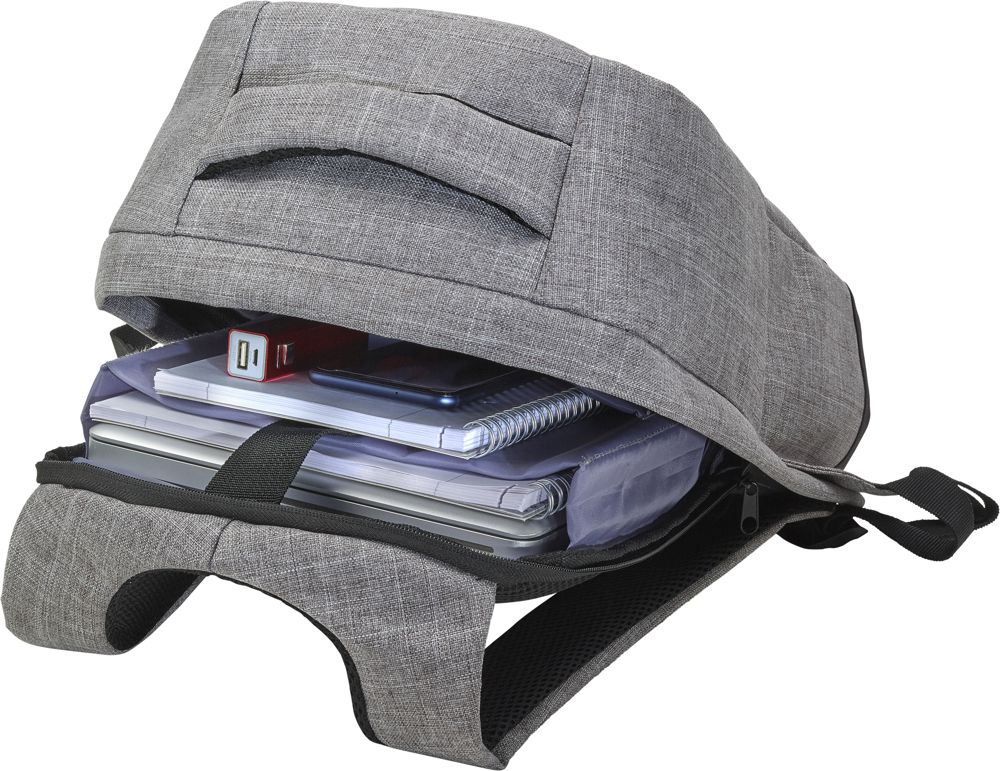 Polyester two-tone (600D) anti-diefstal rugtas met PVC achterkant. Met speciaal compartiment voor laptop (13 inch), vakken aan de binnenkant, een ritsvak aan de buitenkant (achter) en aan de zijkant een USB poort met kabel naar binnen.