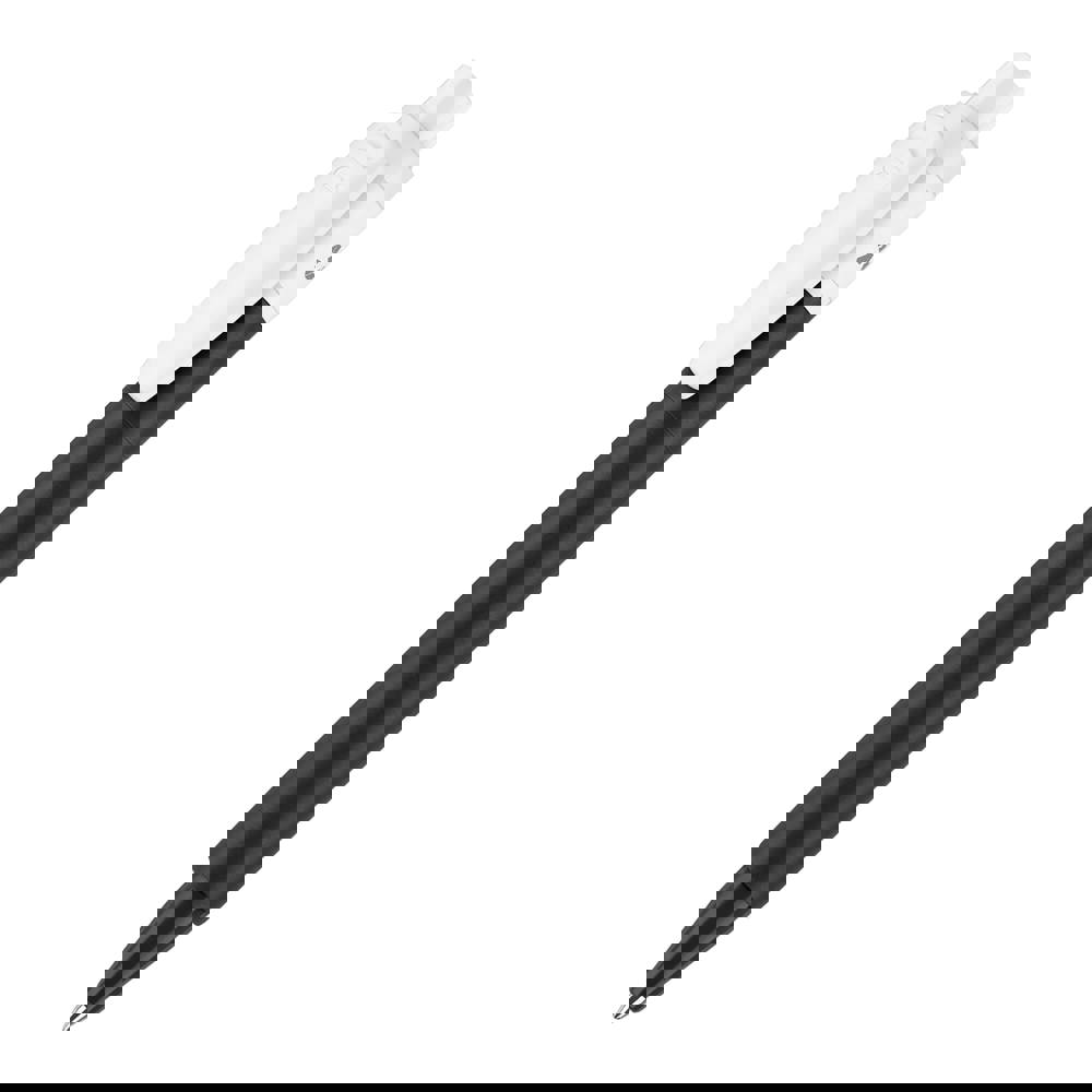Metalen, gelakte balpen met drukknop, blauwschrijvend. De clip en tip zijn zwart en matchen met de rubberen strips voor extra grip.