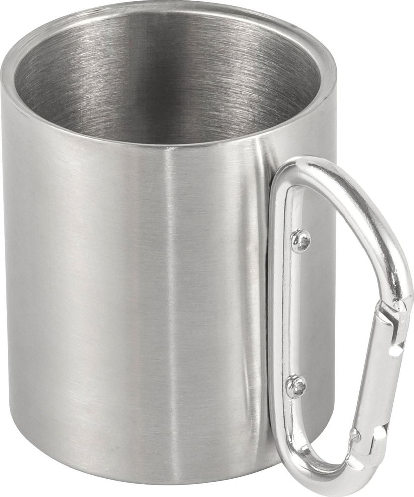 Roestvrijstalen, dubbelwandige reis mok (185 ml). Het handvat is tevens een karabijnhaak.