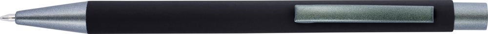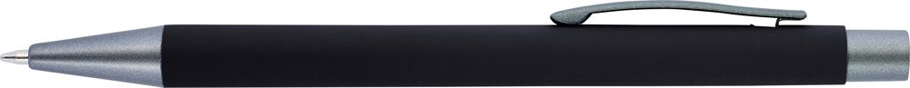 Balpen met rubberen toplaag. De tip, top en clip hebben een donkergrijze kleur. De onderlaag is zichtbaar bij laser graveren. Blauwschrijvend.