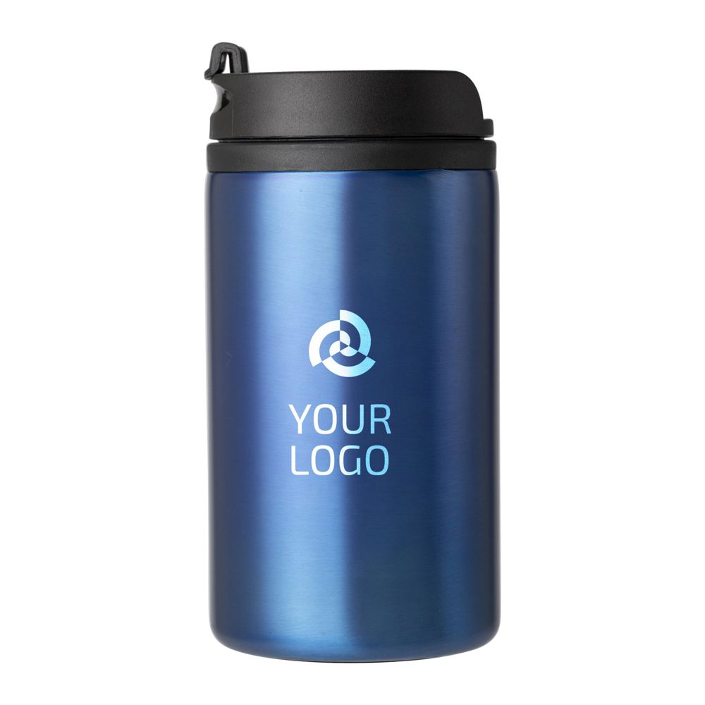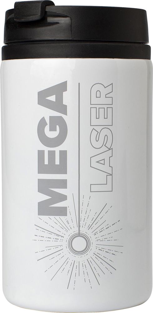 Roestvrijstalen dubbelwandige thermosbeker (300 ml). De buitenwand is roestvrijstaal, de binnenwand is van plastic. De draaidop is lekbestendig met een opening die dicht klikt. De bodem is antislip. We raden het af om lasergravering toe te passen op de kleur rood (008).