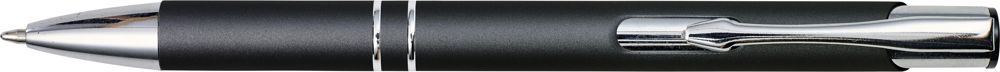 Metalen balpen, blauwschrijvend, met rubber en twee zilverkleurige ringen, clip en tip.