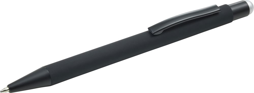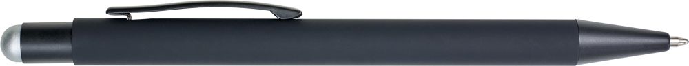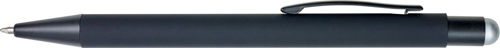 ABS en aluminium balpen, blauwschrijvend, met rubberen coating. De onderlaag van de houder en rubberen stylus top zijn gekleurd. Bij graveren zal het logo dezelfde kleur hebben als de top.