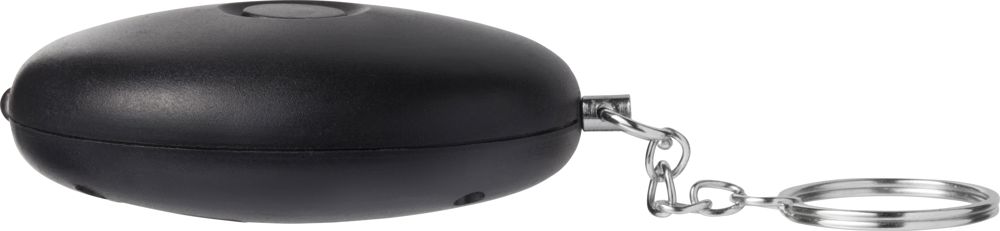 ABS persoonlijk alarm met stalen sleutelring. Het LED licht wordt geactiveerd met de drukknop. Het alarm wordt geactiveerd door de pin eruit te trekken. Inclusief batterijen.