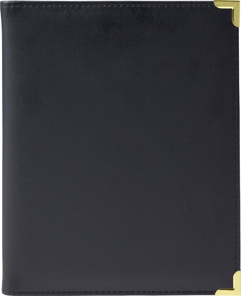 PU documentenmap (A5), met metalen hoeken en diverse insteekvakken, excl. schrijfblok en pen. De blauwe versie bevat zilveren hoeken, de zwarte versie bevat gouden hoeken.