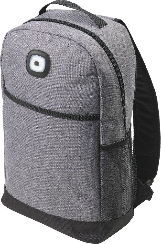 Polyester (300D + 210D) tweekleurige rugtas met verstelbare en gewatteerde schouderbanden en rug. Groot vak, voorvak en gazen insteekvak. De rugtas heeft een COB lampje met twee instellingen: wit licht en knipperend rood licht. Inclusief batterijen.