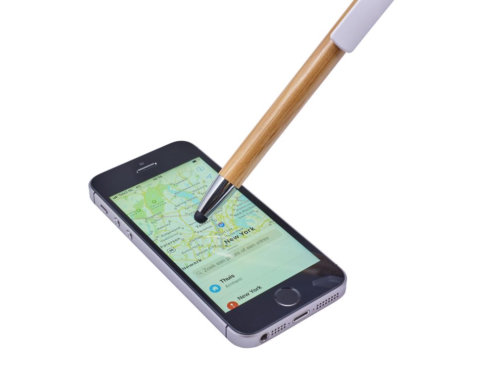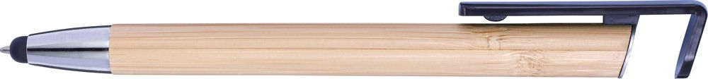 Bamboe balpen, blauwschrijvend, en stylus in één. De houder is gemaakt van bamboe, de tip en clip zijn kunststof. De clip is tevens de drukknop en doet dienst als telefoonstandaard.