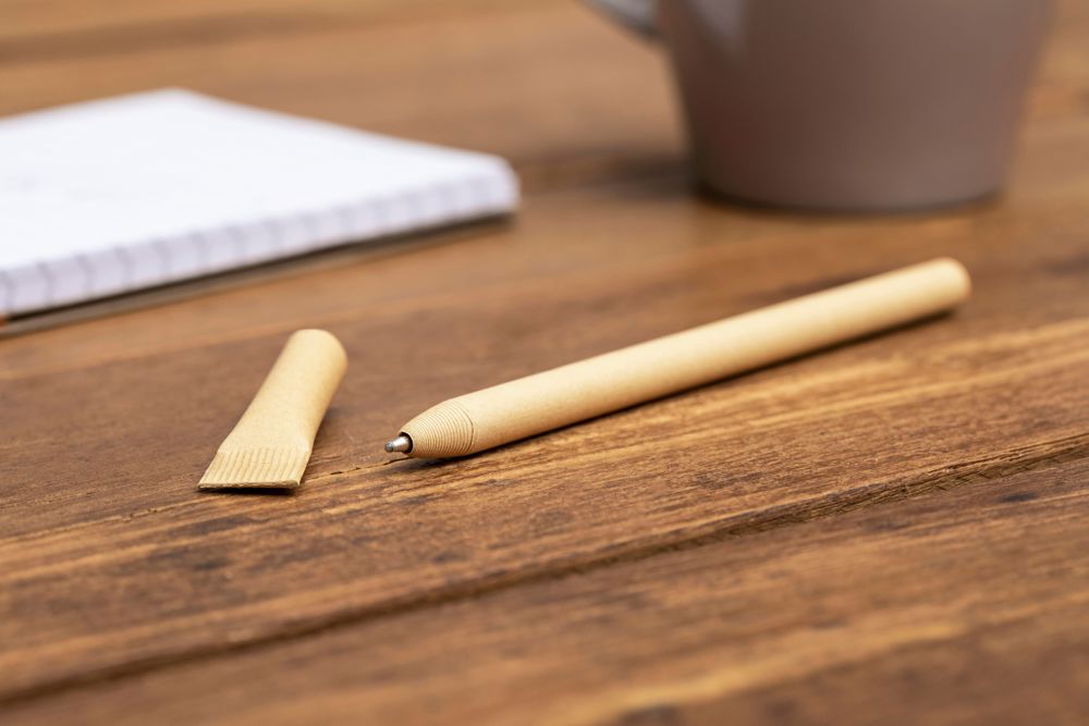 Gerecycled kartonnen pen, blauwschrijvend, met dop.