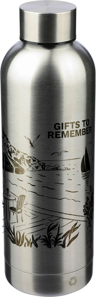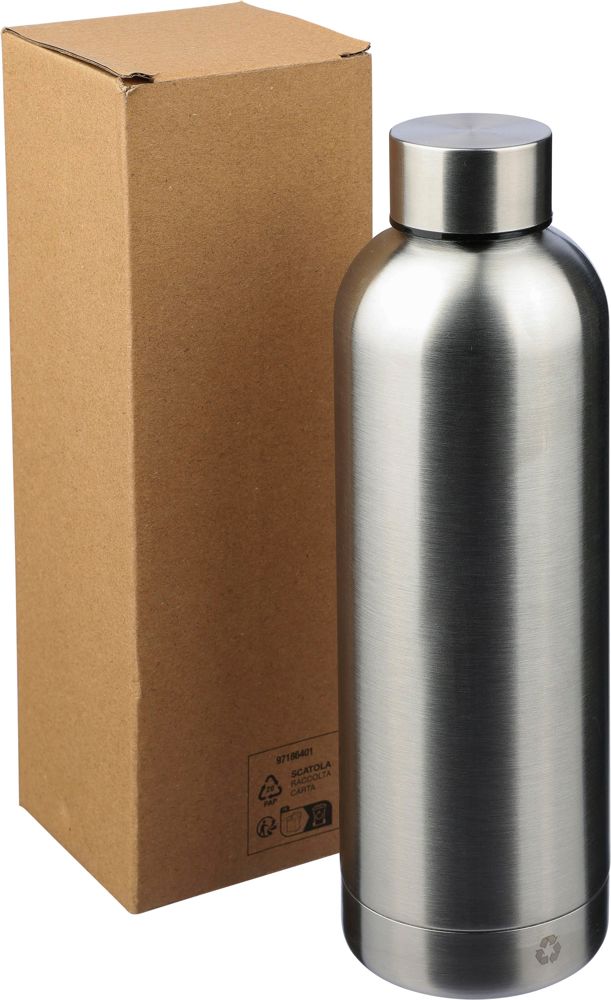 Gerecyclede dubbelwandige roestvrijstalen fles (500 ml met matte finish. De fles is gemaakt van roestvrij staal 304. Per stuk verpakt in een bruin kartonnen doos. Zilver (032) is geen matte uitvoering, maar heeft een standaard afwerking.