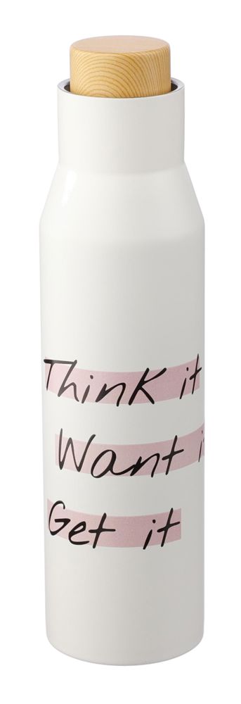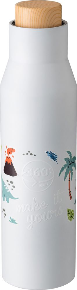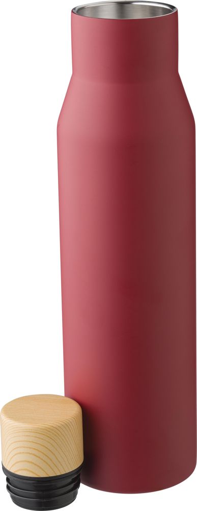 RVS (s/s304) fles (500 ml) met een dubbele wand en een kunststof dop met bamboe-look. Individueel verpakt in een bruine kartonnen doos.