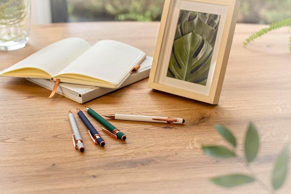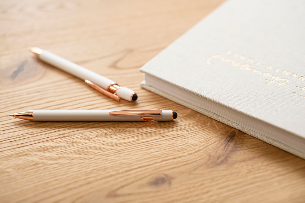Aluminium balpen met roségouden details en stylus. Blauwschrijvend. Bij het graveren zal het ontwerp zilverkleurig zijn.