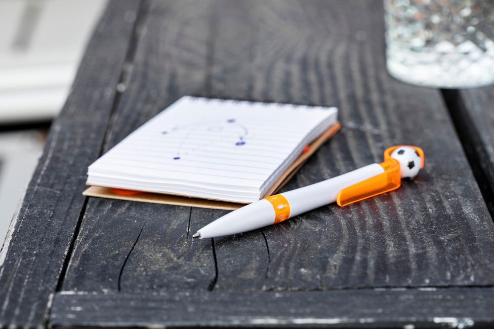 Kunststof balpen, blauwschrijvend, model 'voetbal'.