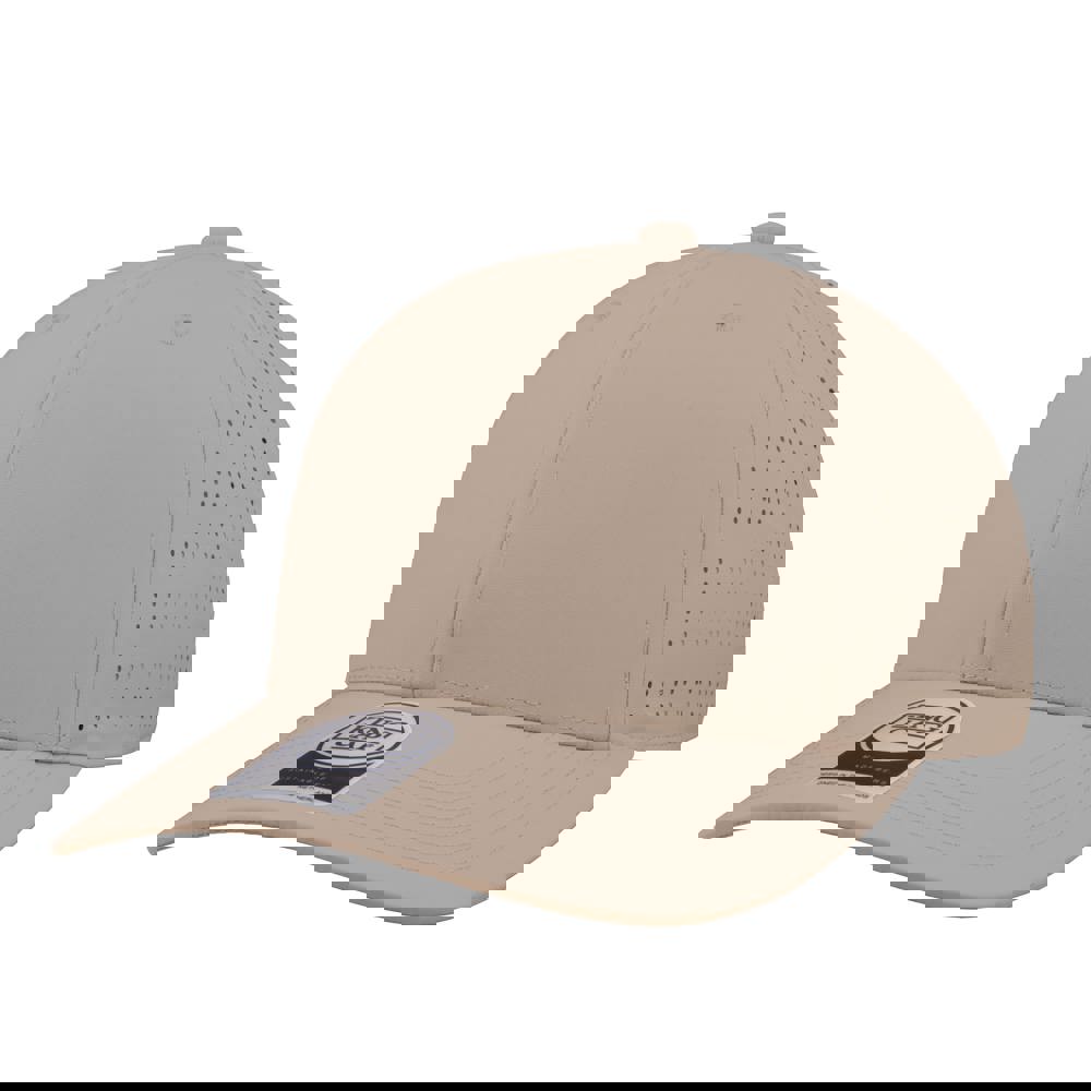6 panel cap met frontvoering. Voorzien van gelaserde vertilatiegaatjes aan de zijkant en achterkant. Medium profile. Soft kunststoffen druksluiting. Uitgevoerd in 100% gerecycled nylon.