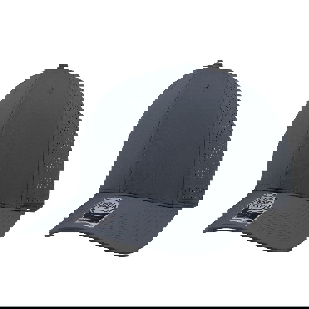 6 panel cap met frontvoering. Voorzien van gelaserde vertilatiegaatjes aan de zijkant en achterkant. Medium profile. Soft kunststoffen druksluiting. Uitgevoerd in 100% gerecycled nylon.