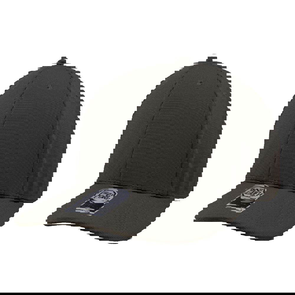 6 panel sports cap met frontvoering. Voorzien van een memory visor. Medium profile. Mat zwarte open metalen gesp sluiting. Uitgevoerd in 97% gerecycled ottoman en 3% spandex. UPF50+ zonbescherming.