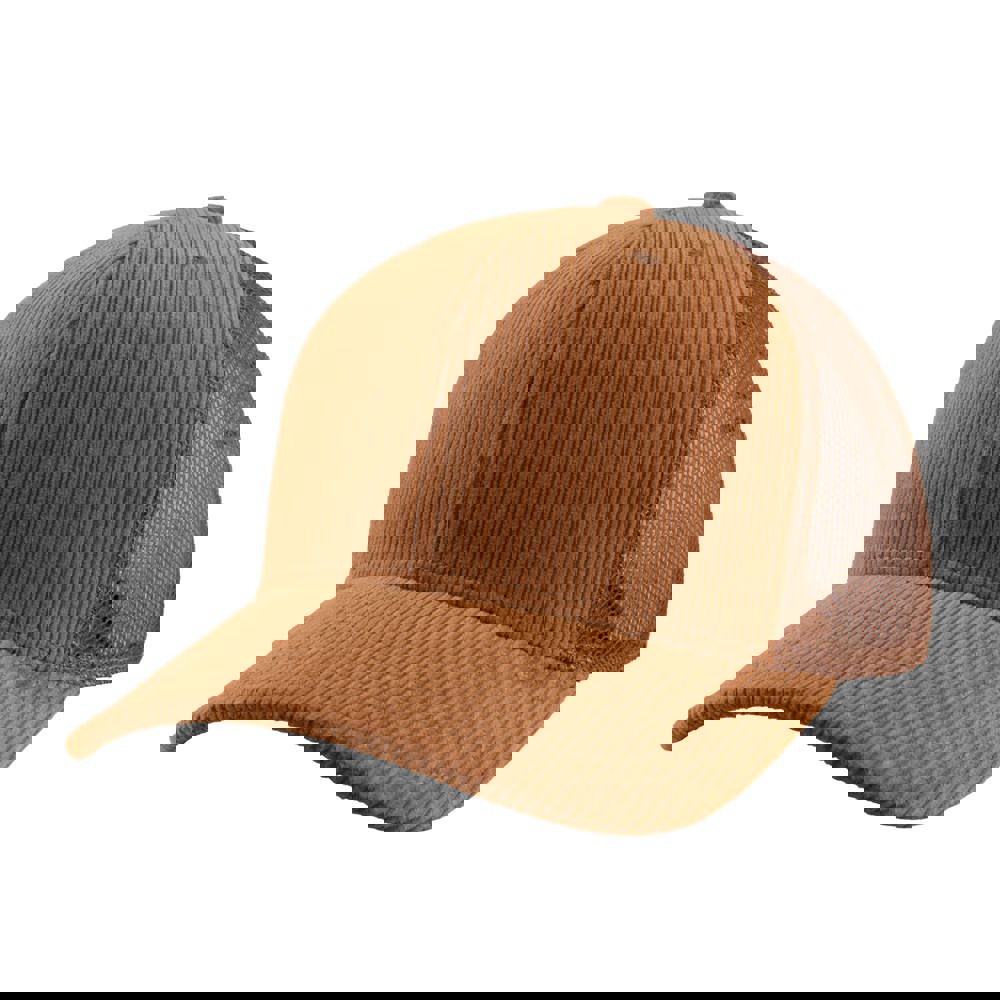 6 panel trucker cap met frontvoering. Medium profile. Kunststof druksluiting. Uitgevoerd in gerecycled mesh en corduroy.