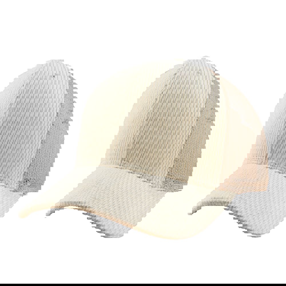 6 panel trucker cap met frontvoering. Medium profile. Kunststof druksluiting. Uitgevoerd in gerecycled mesh en corduroy.