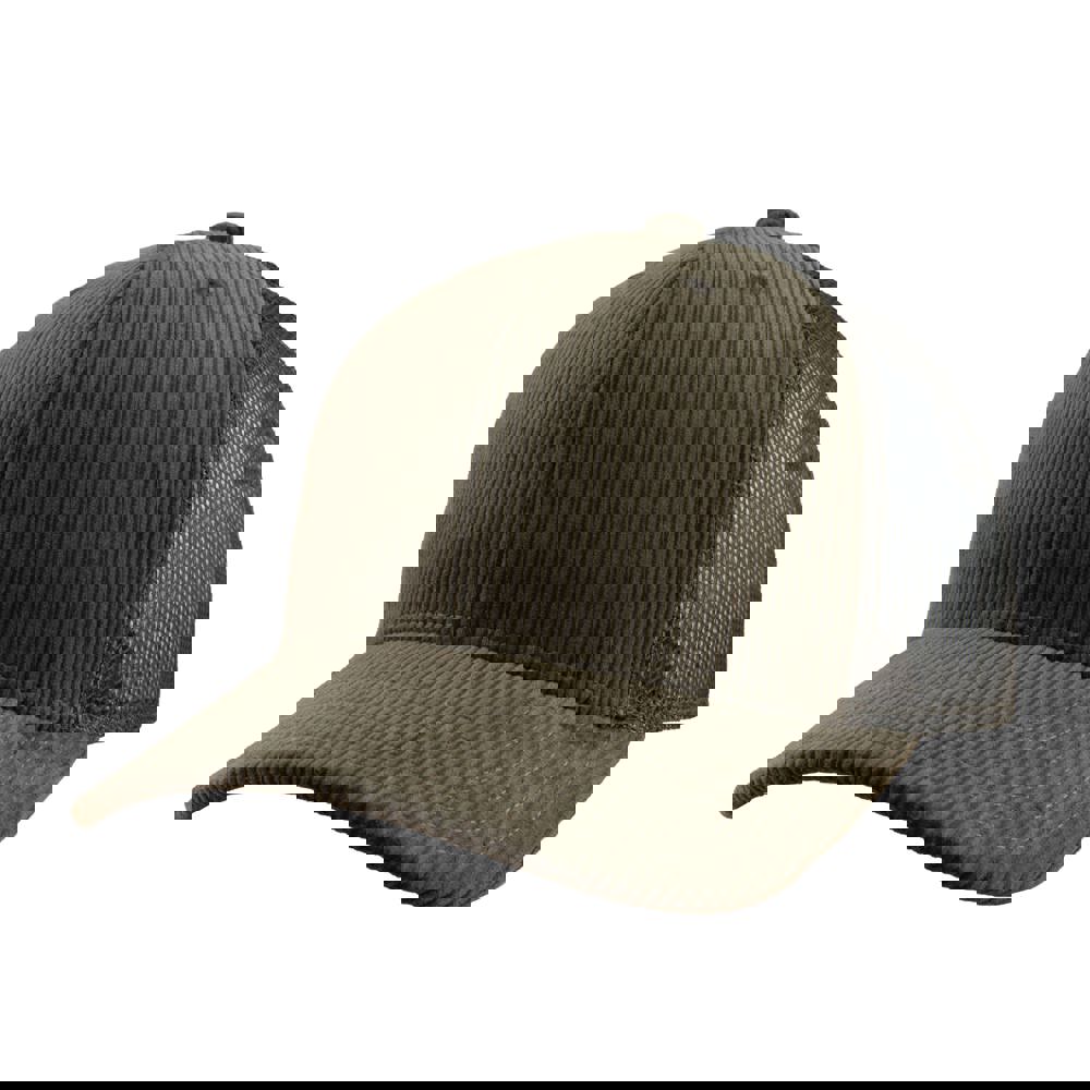 6 panel trucker cap met frontvoering. Medium profile. Kunststof druksluiting. Uitgevoerd in gerecycled mesh en corduroy.