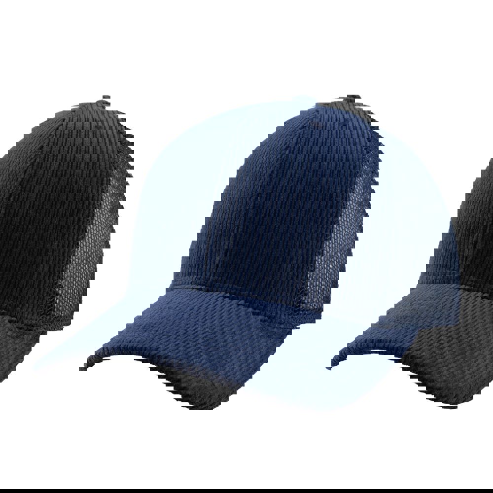6 panel trucker cap met frontvoering. Medium profile. Kunststof druksluiting. Uitgevoerd in gerecycled mesh en corduroy.