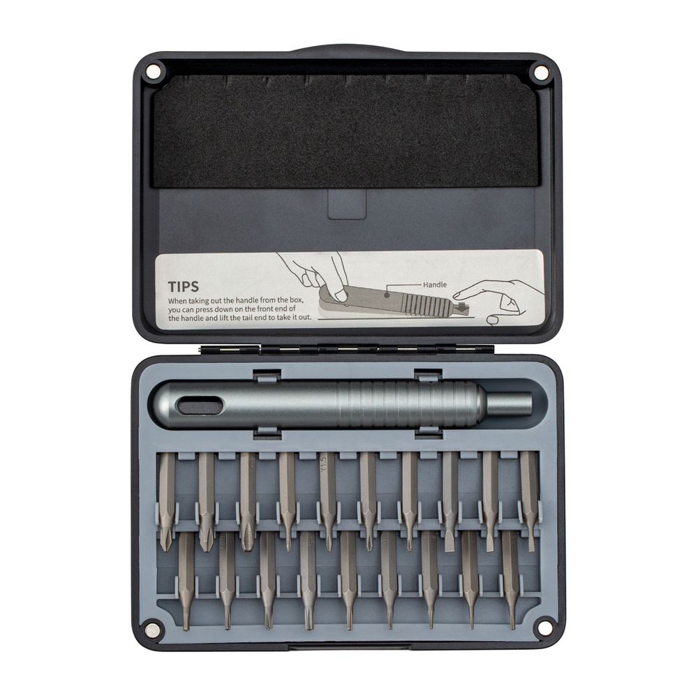 Precieze taken vragen om precies gereedschap. Deze hoogwaardige set mechanisch precisiegereedschap in een stijlvolle witte box is speciaal ontworpen voor ingewikkelde taken aan laptops, computers, brillen en dergelijke. De matte schroevendraaier met bithouder, samen met de 19 magnetische bits gemaakt van ultrahard S2 roestvrij staal - inclusief 9 sterschroefbits, 2 platkopschroefbits en 8 kruiskopschroefbits - zorgen voor maximaal aanpassingsvermogen en precisie. De box, gemaakt van gerecycled ABS-kunststof, straalt niet alleen elegantie uit, maar bergt de inhoud ook veilig op dankzij de hoogwaardige magnetische sluiting. De binnenkant, gemaakt van gerecycled polypropyleen, beschermt en organiseert het gereedschap optimaal.